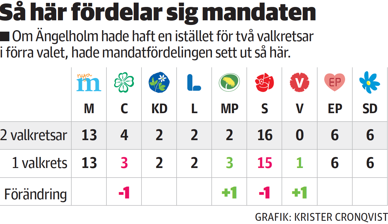 Två valkretsar slås ihop till en stor i Ängelholm. Det kan påverka mandatfördelningen i det kommande valet. Om det varit så i förra valet hade Vänsterpartiet kommit in i fullmäktige.